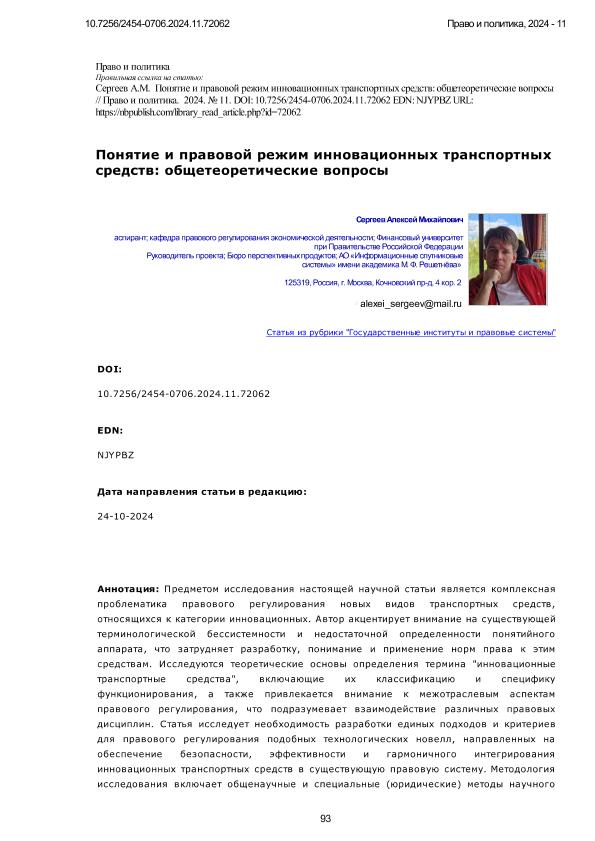 Сергеев, А.М. Понятие и правовой режим инновационных транспортных средств: общетеоретические вопросы. — Текст: электронный // Право и политика. – 2024. – № 11. — С. 93-106. - URL: https://nbpublish.com/library_read_article.php?id=72062. - Дата публикации: 02.12.2024 — <URL:http://elib.fa.ru/art2024/bv3880.pdf>.
