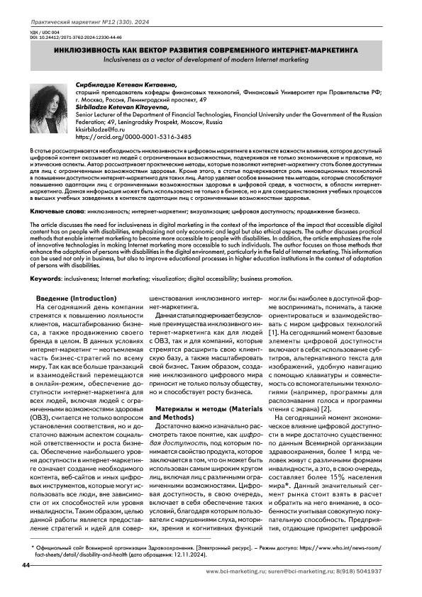 Сирбиладзе, К.К. Инклюзивность как вектор развития современного интернет-маркетинга // Практический маркетинг. – 2024. – № 12. — С. 44-46. — Только в электронном виде. — <URL:http://elib.fa.ru/art2024/bv3881.pdf>.