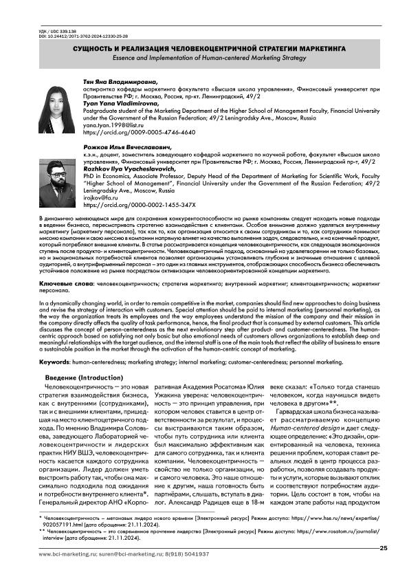 Тян, Я.В. Сущность и реализация человекоцентричной стратегии маркетинга / Я.В. Тян, И.В. Рожков // Практический маркетинг. – 2024. – № 12. — С. 25-28. — Только в электронном виде. — <URL:http://elib.fa.ru/art2024/bv3912.pdf>.