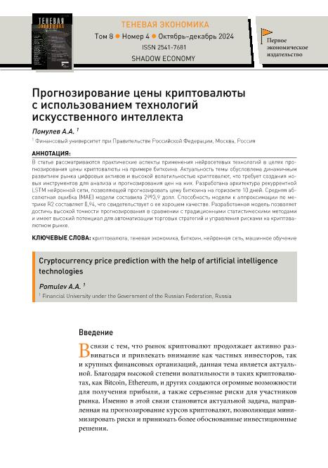 Помулев, А.А. Прогнозирование цены криптовалюты с использованием технологий искусственного интеллекта // Теневая экономика. – 2024. – № 4. — С. 347-362. — Только в электронном виде. — <URL:http://elib.fa.ru/art2024/bv3969.pdf>.