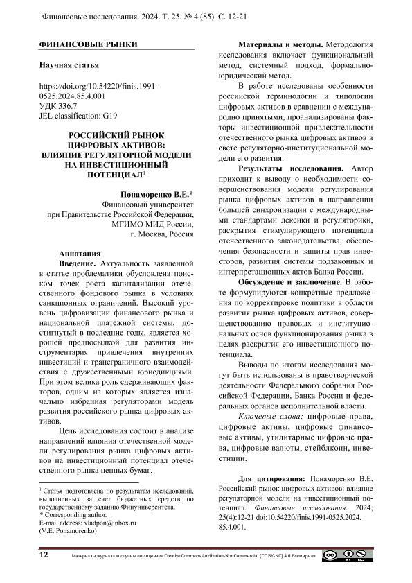 Понаморенко, В.Е. Российский рынок цифровых активов: влияние регуляторной модели на инвестиционный потенциал // Финансовые исследования. – 2024. – № 4. — С. 12-21. — Только в электронном виде. — <URL:http://elib.fa.ru/art2024/bv3970.pdf>.