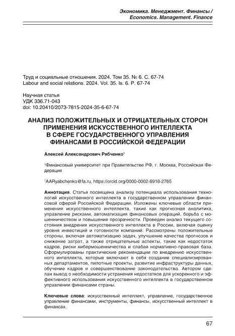 Рябченко, А.А. Анализ положительных и отрицательных сторон применения искусственного интеллекта в сфере государственного управления финансами в Российской Федерации // Труд и социальные отношения. – 2024. – № 6. — С. 67-74. — Только в электронном виде. — <URL:http://elib.fa.ru/art2024/bv3973.pdf>.