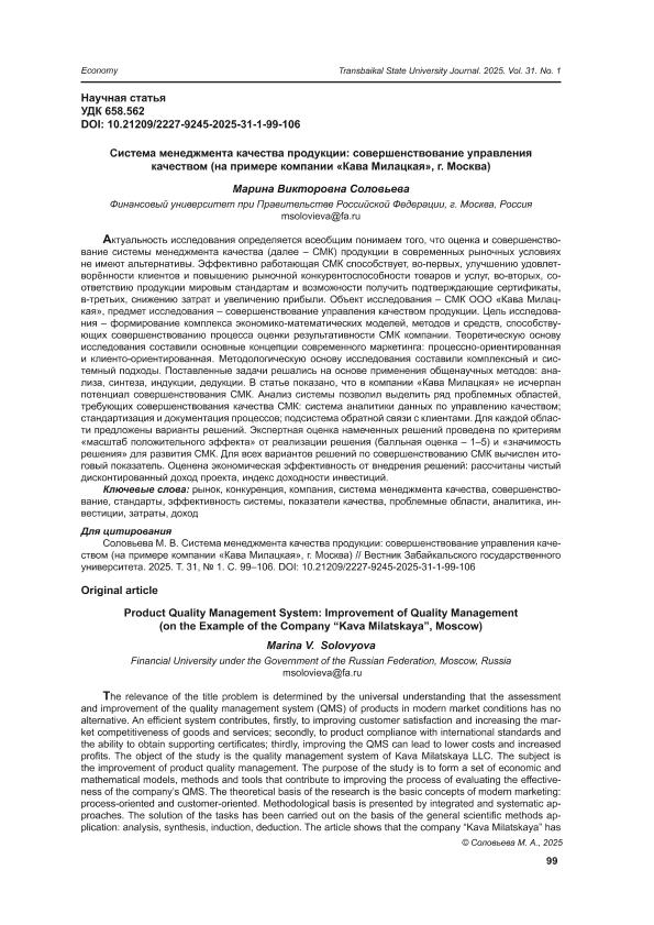 Соловьева, М.В. Система менеджмента качества продукции: совершенствование управления качеством (на примере компании «Кава Милацкая», г. Москва) // Вестник Забайкальского государственного университета. – 2025. – № 1. — С. 99-106. — Только в электронном виде. — <URL:http://elib.fa.ru/art2025/bv1117.pdf>.
