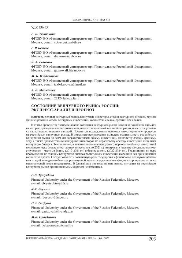 Состояние венчурного рынка России: экспресс-анализ и прогноз / Е.Б. Тютюкина, Р.Р. Беюсов, Д.А. Газизова [и др.] // Вестник Алтайской академии экономики и права. – 2025. – № 4-1. — С. 203-209. — Только в электронном виде. — <URL:http://elib.fa.ru/art2025/bv1118.pdf>.