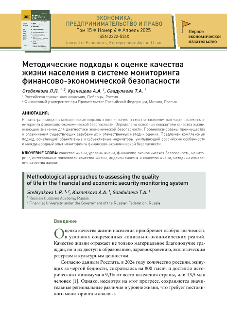 Стеблякова, Л.П. Методические подходы к оценке качества жизни населения в системе мониторинга финансово-экономической безопасности / Л.П. Стеблякова, А.А. Кузнецова, Т.А. Саадулаева // Экономика, предпринимательство и право. – 2025. – № 4. — С. 2905–2918. — Только в электронном виде. — <URL:http://elib.fa.ru/art2025/bv1119.pdf>.