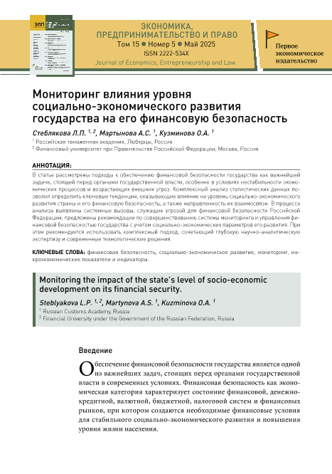 Стеблякова, Л.П. Мониторинг влияния уровня социально-экономического развития государства на его финансовую безопасность / Л.П. Стеблякова, А.С. Мартынова, О.А. Кузминова // Экономика, предпринимательство и право. – 2025. – № 5. — С. 3383-3394. — Только в электронном виде. — <URL:http://elib.fa.ru/art2025/bv1120.pdf>.