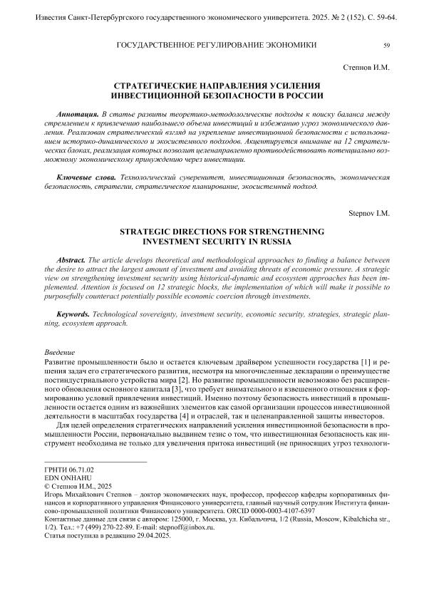 Степнов, И.М. Стратегические направления усиления инвестиционной безопасности России // Известия Санкт-Петербургского государственного экономического университета. – 2025. – № 2. — С. 59-64. — Только в электронном виде. — <URL:http://elib.fa.ru/art2025/bv1121.pdf>.