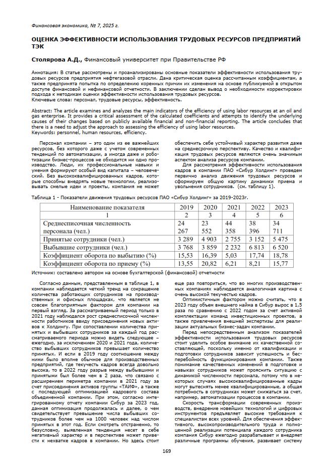 Столярова, А.Д. Оценка эффективности использования трудовых ресурсов предприятий ТЭК // Финансовая экономика. – 2025. – № 7. — С. 169-172 — <URL:http://elib.fa.ru/art2025/bv1122.pdf>.