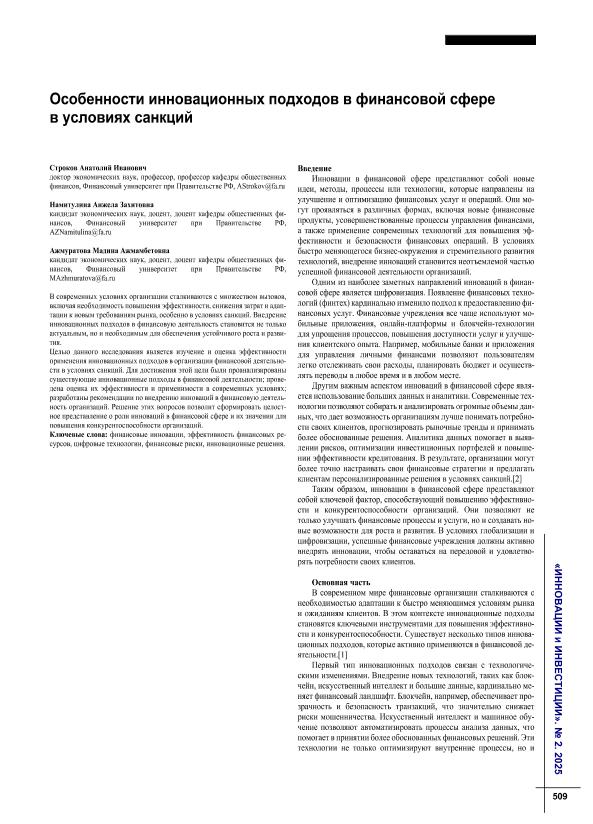 Строков, А.И. Особенности инновационных подходов в финансовой сфере в условиях санкций / А.И. Строков, А.З. Намитулина, М.А. Ажмуратова // Инновации и инвестиции. – 2025. – № 2. — С. 509-511. — Только в электронном виде. — <URL:http://elib.fa.ru/art2025/bv1123.pdf>.