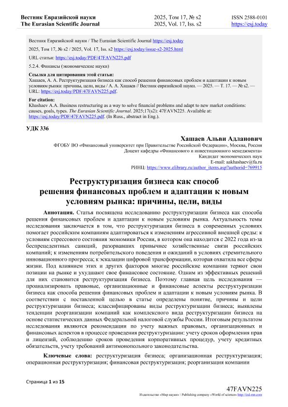 Хашаев, А.А. Реструктуризация бизнеса как способ решения финансовых проблем и адаптации к новым условиям рынка: причины, цели, виды. — Текст: электронный // Вестник Евразийской науки. – 2025. – № s2. — URL: https://esj.today/PDF/47FAVN225.pdf (дата обращения: 24.10.2025) — <URL:http://elib.fa.ru/art2025/bv1204.pdf>.