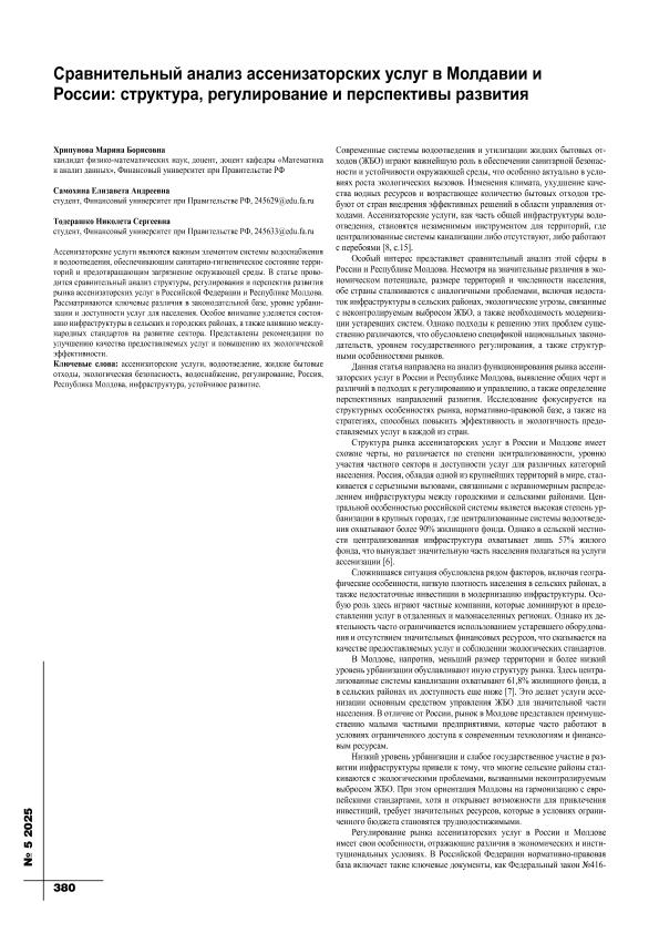 Хрипунова, М.Б. Сравнительный анализ ассенизаторских услуг в Молдавии и России: структура, регулирование и перспективы развития / М.Б. Хрипунова, Е.А. Самохина, Н.С. Тодерашко // Экономика строительства. – 2025. – № 5. — С. 380-381. — Только в электронном виде. — <URL:http://elib.fa.ru/art2025/bv1208.pdf>.