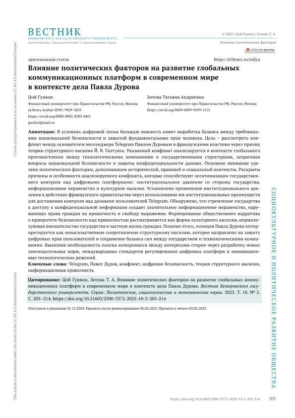 Цой, Г. Влияние политических факторов на развитие глобальных коммуникационных платформ в современном мире в контексте дела Павла Дурова / Г. Цой, Т.А. Зотова // Вестник Кемеровского государственного университета. Серия: Политические, социологические и экономические науки. – 2025. – № 2. — С. 205-214. — Только в электронном виде. — <URL:http://elib.fa.ru/art2025/bv1211.pdf>.