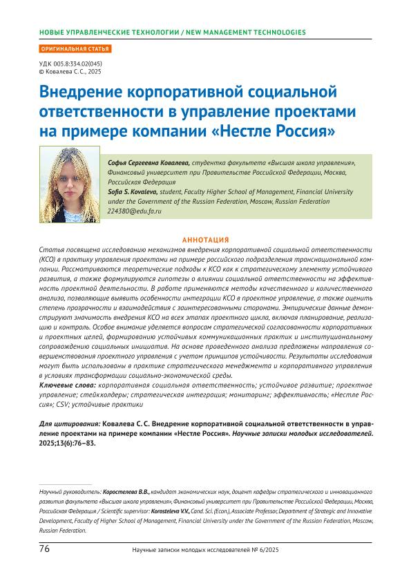 Ковалева, С.С. Внедрение корпоративной социальной ответственности в управление проектами на примере компании «Нестле Россия» // Научные записки молодых исследователей. – 2025. – № 6. — С. 76-83 — <URL:http://elib.fa.ru/art2025/bv1906.pdf>.