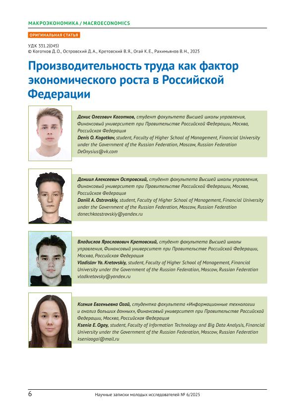 Производительность труда как фактор экономического роста в Российской Федерации / Д.О. Коготков, Д.А. Островский, В.Я. Кретовский [и др.] // Научные записки молодых исследователей. – 2025. – № 6. — С. 6-17 — <URL:http://elib.fa.ru/art2025/bv1907.pdf>.