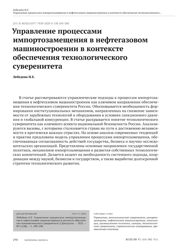 Лебедева, Н.Е. Управление процессами импортозамещения в нефтегазовом машиностроении в контексте обеспечения технологического суверенитета // Дискуссия. – 2025. – № 5. — С. 290-298 — <URL:http://elib.fa.ru/art2025/bv1909.pdf>.