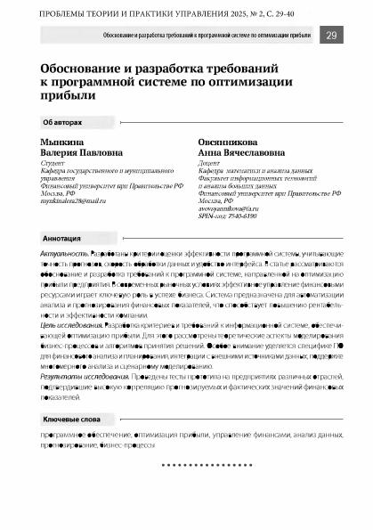 Мынкина, В.П. Обоснование и разработка требований к программной системе по оптимизации прибыли / В.П. Мынкина, А.В. Овсянникова // Проблемы теории и практики управления. – 2025. – № 2. — С. 29-40. — Только в электронном виде. — <URL:http://elib.fa.ru/art2025/bv1911.pdf>.