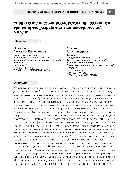 Поздеева, С.Н. Управление пассажирооборотом на воздушном транспорте: разработка эконометрической модели / С.Н. Поздеева, А.А. Кочетков // Проблемы теории и практики управления. – 2025. – № 2. — С. 81-96. — Только в электронном виде. — <URL:http://elib.fa.ru/art2025/bv1913.pdf>.