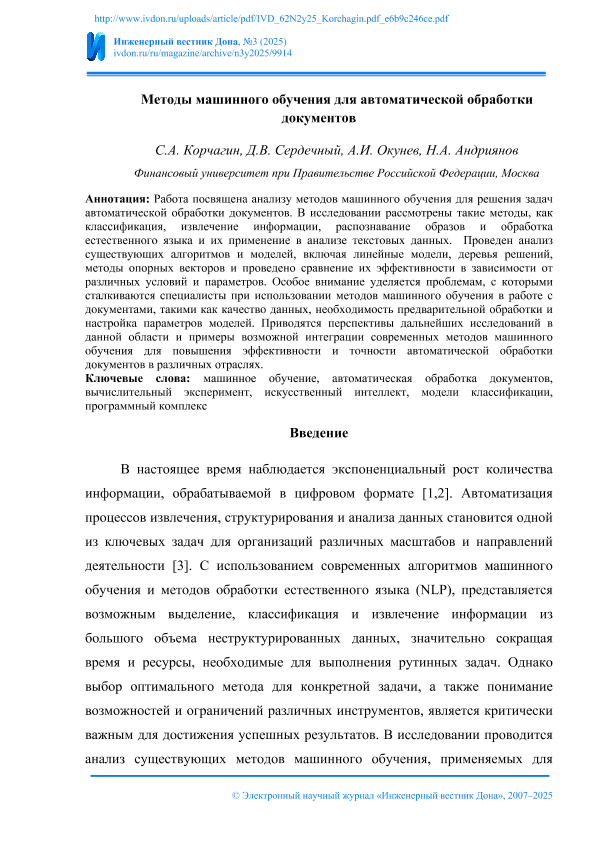 Методы машинного обучения для автоматической обработки документов / С.А. Корчагин, Д.В. Сердечный, А.И. Окунев, Н.А. Андриянов. — Текст: электронный // Инженерный вестник Дона. – 2025. – № 3. — URL: http://www.ivdon.ru/ru/magazine/archive/n3y2025/9914. - Дата публикации: 25.02.2025 — <URL:http://elib.fa.ru/art2025/bv2076.pdf>.