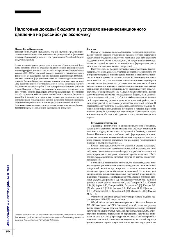 Михина, Е.В. Налоговые доходы бюджета в условиях внешнесанкционного давления на российскую экономику // Инновации и инвестиции. – 2025. – № 8. — С. 574-578. — Только в электронном виде. — <URL:http://elib.fa.ru/art2025/bv2077.pdf>.