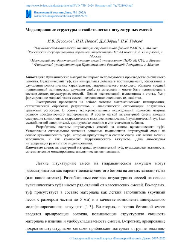 Моделирование структуры и свойств легких штукатурных смесей / И.В. Бессонов, И.И. Попов, Д.А. Зорин, П.К. Гудков. — Текст: электронный // Инженерный вестник Дона. – 2025. – № 1. — URL: http://www.ivdon.ru/ru/magazine/archive/n1y2025/9774. - Дата публикации: 02.01.2025 — <URL:http://elib.fa.ru/art2025/bv2078.pdf>.