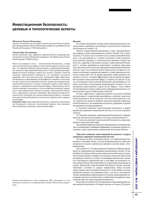 Оболенская, Л.В. Инвестиционная безопасность: целевые и типологические аспекты / Л.В. Оболенская, Н.М. Абдикеев // Инновации и инвестиции. – 2025. – № 8. — С. 43-47. — Только в электронном виде. — <URL:http://elib.fa.ru/art2025/bv2079.pdf>.