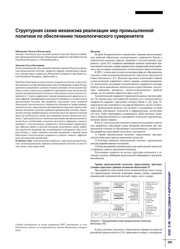 Оболенская, Л.В. Структурная схема механизма реализации мер промышленной политики по обеспечению технологического суверенитета / Л.В. Оболенская, О.В. Данилова // Инновации и инвестиции. – 2025. – № 8. — С. 395-399. — Только в электронном виде. — <URL:http://elib.fa.ru/art2025/bv2080.pdf>.