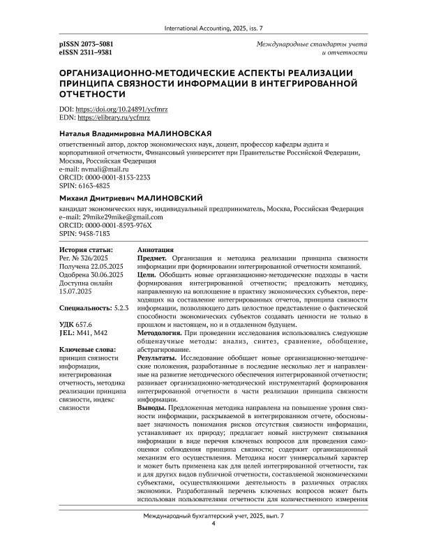 реализации принципа связности информации в интегрированной отчетности / Н.В. Малиновская, М.Д. Малиновский // Международный бухгалтерский учет. – 2025. – № 7. — С. 4-17. — Только в электронном виде. — <URL:http://elib.fa.ru/art2025/bv2171.pdf>.