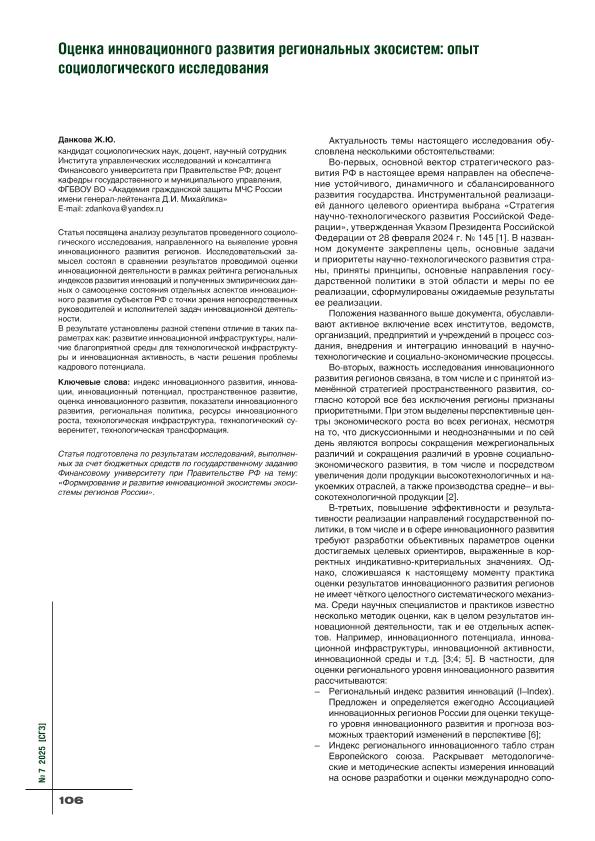 Данкова, Ж.Ю. Оценка инновационного развития региональных экосистем: опыт социологического исследования // Социально-гуманитарные знания. – 2025. – № 7. — С. 106-109. — Только в электронном виде. — <URL:http://elib.fa.ru/art2025/bv2201.pdf>.
