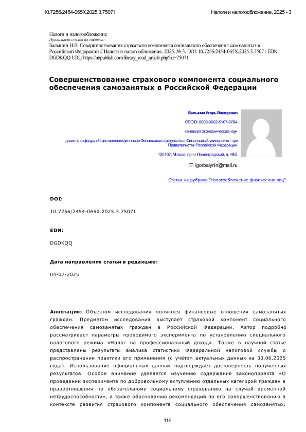Балынин, И.В. Совершенствование страхового компонента социального обеспечения самозанятых в Российской Федерации. — Текст: электронный // Налоги и налогообложение. – 2025. – № 3. — С. 116-126. - URL: https://nbpublish.com/library_read_article.php?id=75071. - Дата публикации: 03.08.2025 — <URL:http://elib.fa.ru/art2025/bv2202.pdf>.