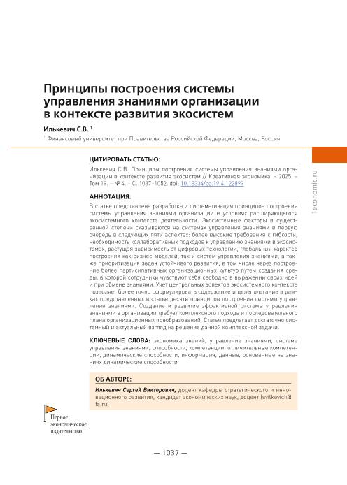 Илькевич, С.В. Принципы построения системы управления знаниями организации в контексте развития экосистем // Креативная экономика. – 2025. – № 4. — С. 1037-1052. — Только в электронном виде. — <URL:http://elib.fa.ru/art2025/bv2500.pdf>.