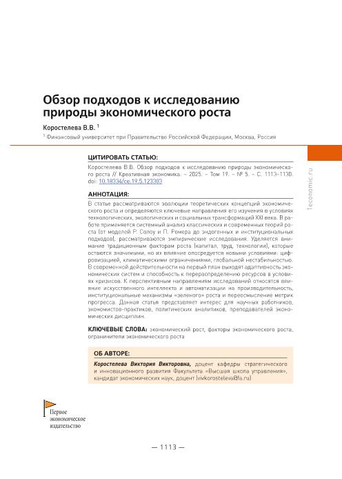 Коростелева, В.В. Обзор подходов к исследованию природы экономического роста // Креативная экономика. – 2025. – № 5. — С. 1113-1130. — Только в электронном виде. — <URL:http://elib.fa.ru/art2025/bv2502.pdf>.