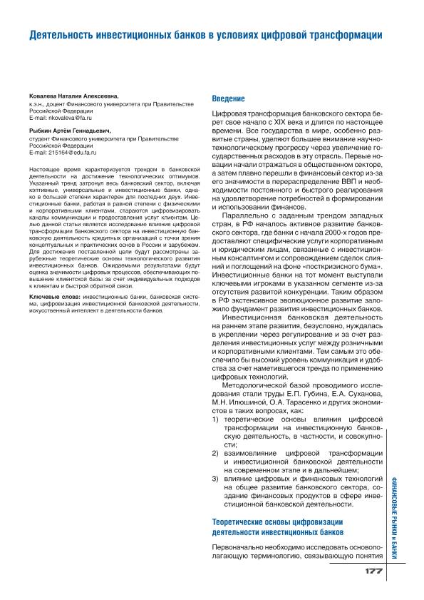 Ковалева, Н.А. Деятельность инвестиционных банков в условиях цифровой трансформации / Н.А. Ковалева, А.Г. Рыбкин // Финансовые рынки и банки. – 2025. – № 3. — С. 177-182. — Только в электронном виде. — <URL:http://elib.fa.ru/art2025/bv2582.pdf>.