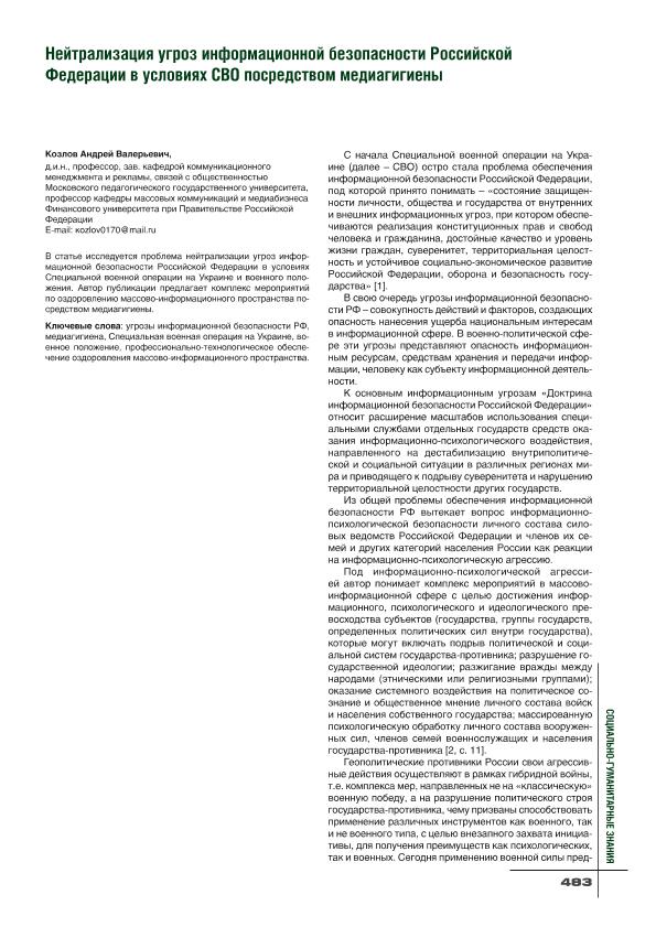 Козлов, А.В. Нейтрализация угроз информационной безопасности Российской Федерации в условиях СВО посредством медиагигиены // Социально-гуманитарные знания. – 2025. – № 5. — С. 483-486. — Только в электронном виде. — <URL:http://elib.fa.ru/art2025/bv2583.pdf>.