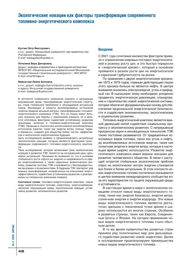 Кухтин, П.В. Экологические новации как факторы трансформации современного топливно-энергетического комплекса / П.В. Кухтин, В.Д. Петелина, Л.А. Майсигова // Финансовые рынки и банки. – 2025. – № 3. — С. 48-52. — Только в электронном виде. — <URL:http://elib.fa.ru/art2025/bv2585.pdf>.