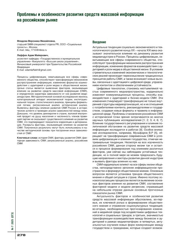 Младова, В.М. Проблемы и особенности развития средств массовой информации на российском рынке // Социально-гуманитарные знания. – 2025. – № 7. — С. 278-284. — Только в электронном виде. — <URL:http://elib.fa.ru/art2025/bv2586.pdf>.