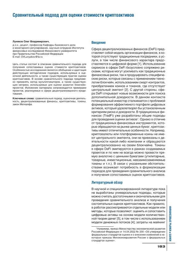 Луняков, О.В. Сравнительный подход для оценки стоимости криптоактивов // Финансовые рынки и банки. – 2025. – № 2. — С. 183-190. — Только в электронном виде. — <URL:http://elib.fa.ru/art2025/bv2587.pdf>.
