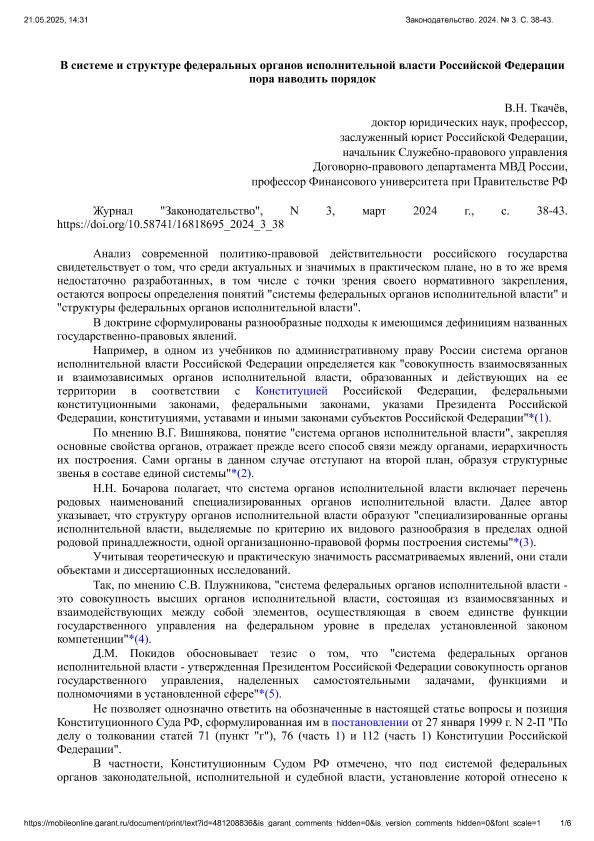 Ткачев, В.Н. В системе и структуре федеральных органов исполнительной власти Российской Федерации пора наводить порядок // Законодательство. – 2024. – № 3. — С. 38-43. — Только в электронном виде. — <URL:http://elib.fa.ru/art2024/bv3627.pdf>.
