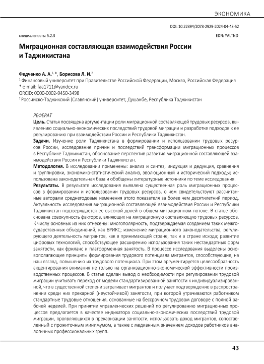 Федченко, А.А. Миграционная составляющая взаимодействия России и Таджикистана / А.А. Федченко, Л.И. Борисова // Евразийская интеграция: экономика, право, политика. – 2024. – № 4. — С. 43-52. — Только в электронном виде. — <URL:http://elib.fa.ru/art2024/bv3628.pdf>.