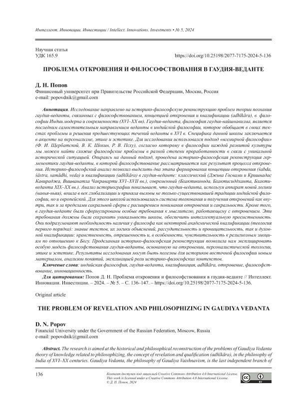 Попов, Д.Н. Проблема откровения и философствования в гаудия-веданте // Интеллект. Инновации. Инвестиции. – 2024. – № 5. — С. 136-147. — Только в электронном виде. — <URL:http://elib.fa.ru/art2024/bv3668.pdf>.