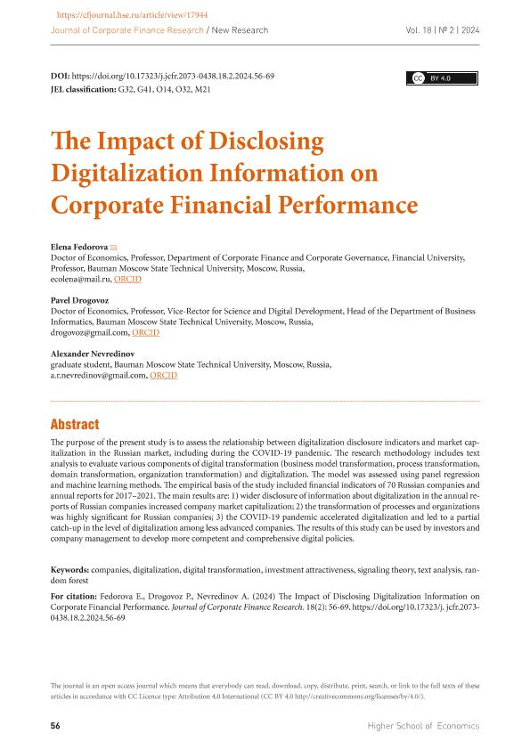 Fedorova E. (Федорова Е.). The Impact of Disclosing Digitalization Information on Corporate Financial Performance = Влияние раскрытия информации о цифровизации на финансовые показатели компании / Fedorova E. (Федорова Е.), Drogovoz P. (Дроговоз П.), Nevredinov A. (Неврединов А.). — Текст: электронный // Journal of Corporate Finance Research / Корпоративные финансы. – 2024. – № 2. — С. 56-69.- URL: https://cfjournal.hse.ru/article/view/17944 (дата обращения: 25.06.2025) — <URL:http://elib.fa.ru/art2024/bv3676.pdf>.