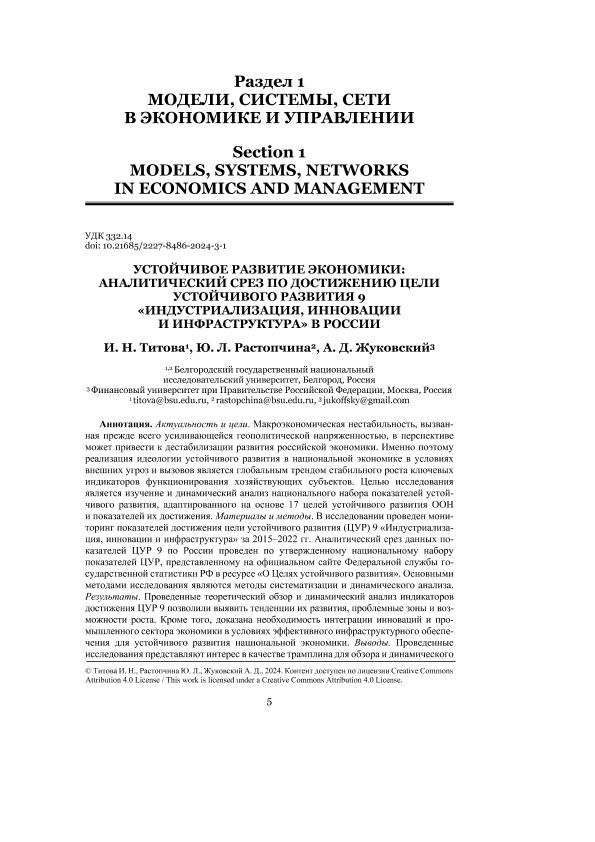 Титова, И.Н. Устойчивое развитие экономики: аналитический срез по достижению цели устойчивого развития 9 «Индустриализация, инновации и инфраструктура» в России / И.Н. Титова, Ю.Л. Растопчина, А.Д. Жуковский // Модели, системы, сети в экономике, технике, природе и обществе. – 2024. – № 3. — С. 5-20. — Только в электронном виде. — <URL:http://elib.fa.ru/art2024/bv3844.pdf>.