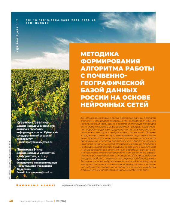 Кузьмина, Э. Методика формирования алгоритма работы с почвенно-географической базой данных России на основе нейронных сетей / Э. Кузьмина, Н. Пьянкова // Информационные ресурсы России. – 2024. – № 5. — С. 40-47. — Только в электронном виде. — <URL:http://elib.fa.ru/art2024/bv3949.pdf>.