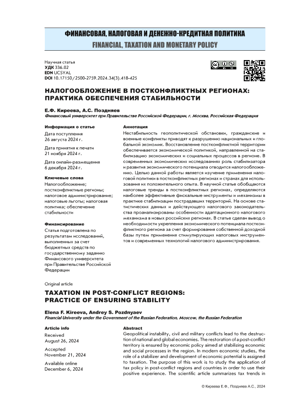 Киреева, Е.Ф. Налогообложение в постконфликтных регионах: практика обеспечения стабильности / Е.Ф. Киреева, А.С. Поздняев // Известия Байкальского государственного университета. – 2024. – № 3. — С. 418-425. — Только в электронном виде. — <URL:http://elib.fa.ru/art2024/bv3603.pdf>.