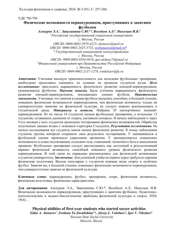 Физические возможности первокурсников, приступивших к занятиям футболом / Э.А. Аленуров, С.Ю. Завалишина, А.Л. Волобуев, И.В. Николаев // Культура физическая и здоровье. – 2024. – № 3. — С. 257-260. — Только в электронном виде. — <URL:http://elib.fa.ru/art2024/bv3662.pdf>.