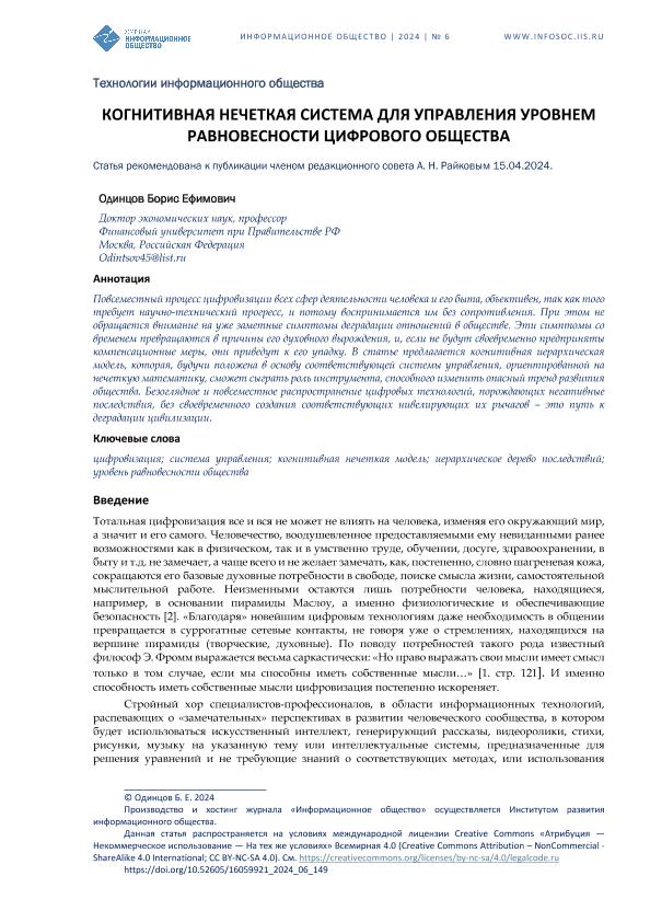 Одинцов, Б.Е. Когнитивная нечеткая система для управления уровнем равновесности цифрового общества // Информационное общество. – 2024. – № 6. — С. 149-167. — Только в электронном виде. — <URL:http://elib.fa.ru/art2024/bv3663.pdf>.