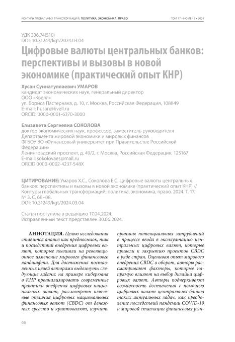 Умаров, Х.С. Цифровые валюты центральных банков: перспективы и вызовы в новой экономике (практический опыт КНР) / Х.С. Умаров, Е.С. Соколова // Контуры глобальных трансформаций: политика, экономика, право. – 2024. – № 3. — С. 68-88. — Только в электронном виде. — <URL:http://elib.fa.ru/art2024/bv3674.pdf>.