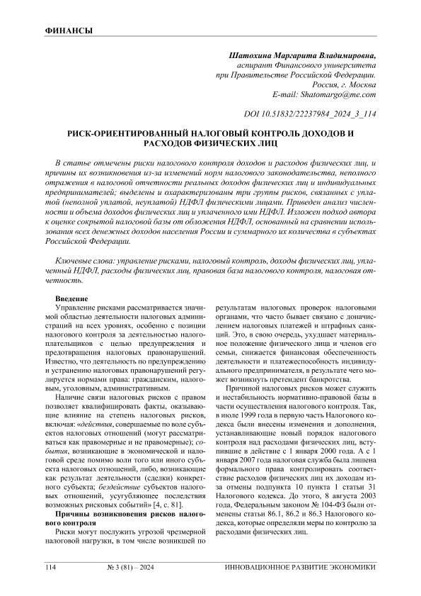 Шатохина, М.В. Риск-ориентированный налоговый контроль доходов и расходов физических лиц // Инновационное развитие экономики. – 2024. – № 3. — С. 114-121. — Только в электронном виде. — <URL:http://elib.fa.ru/art2024/bv3680.pdf>.