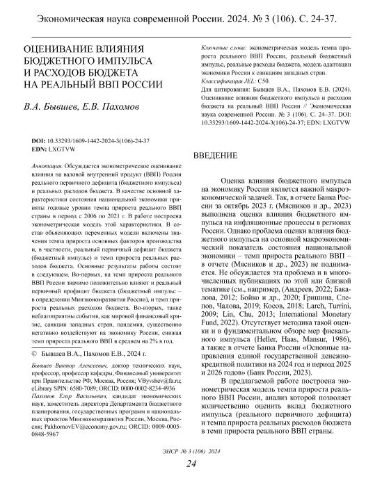 бюджета на реальный ВВП России / В.А. Бывшев, Е.В. Пахомов // Экономическая наука современной России. – 2024. – № 3. — С. 24-37. — Только в электронном виде. — <URL:http://elib.fa.ru/art2024/bv3887.pdf>.