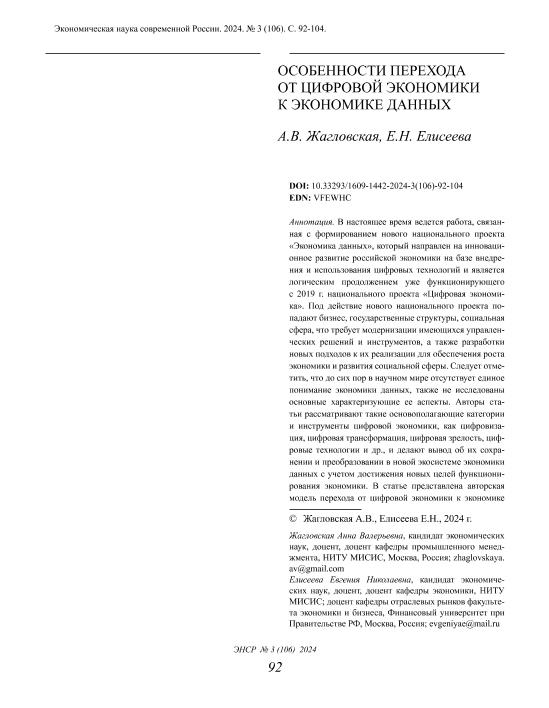 Жагловская, А.В. Особенности перехода от цифровой экономики к экономике данных / А.В. Жагловская, Е.Н. Елисеева // Экономическая наука современной России. – 2024. – № 3. — С. 92-104. — Только в электронном виде. — <URL:http://elib.fa.ru/art2024/bv3890.pdf>.