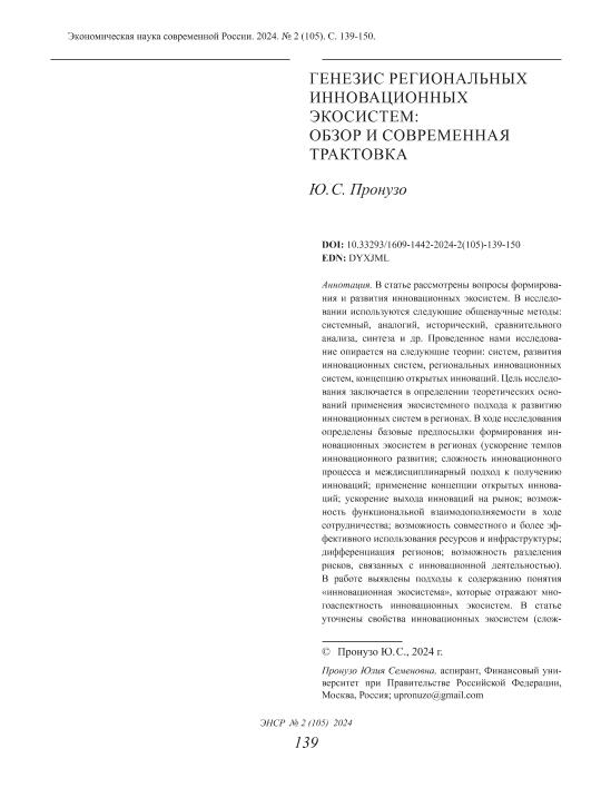 Пронузо, Ю.С. Генезис региональных инновационных экосистем: обзор и современная трактовка // Экономическая наука современной России. – 2024. – № 2. — С. 139-150. — Только в электронном виде. — <URL:http://elib.fa.ru/art2024/bv3908.pdf>.